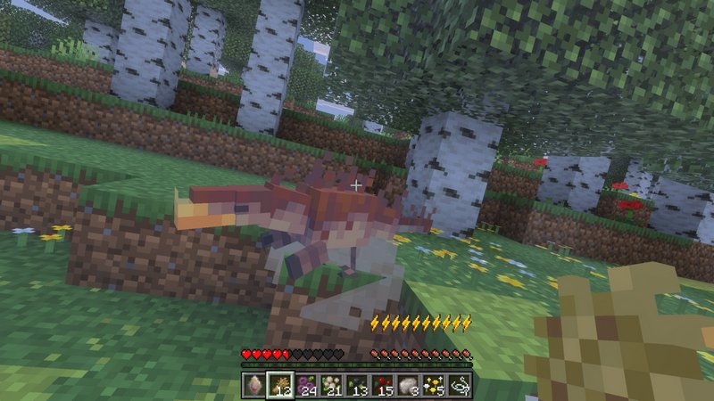 The core feature of MCArk is taming dinosaurs. In a world this hostile, dinosaurs are essential allies that provide much-needed assistance in combat. Without them, survival is difficult – during my first few minutes, I died several times just by drawing the attention of dangerous predators!
